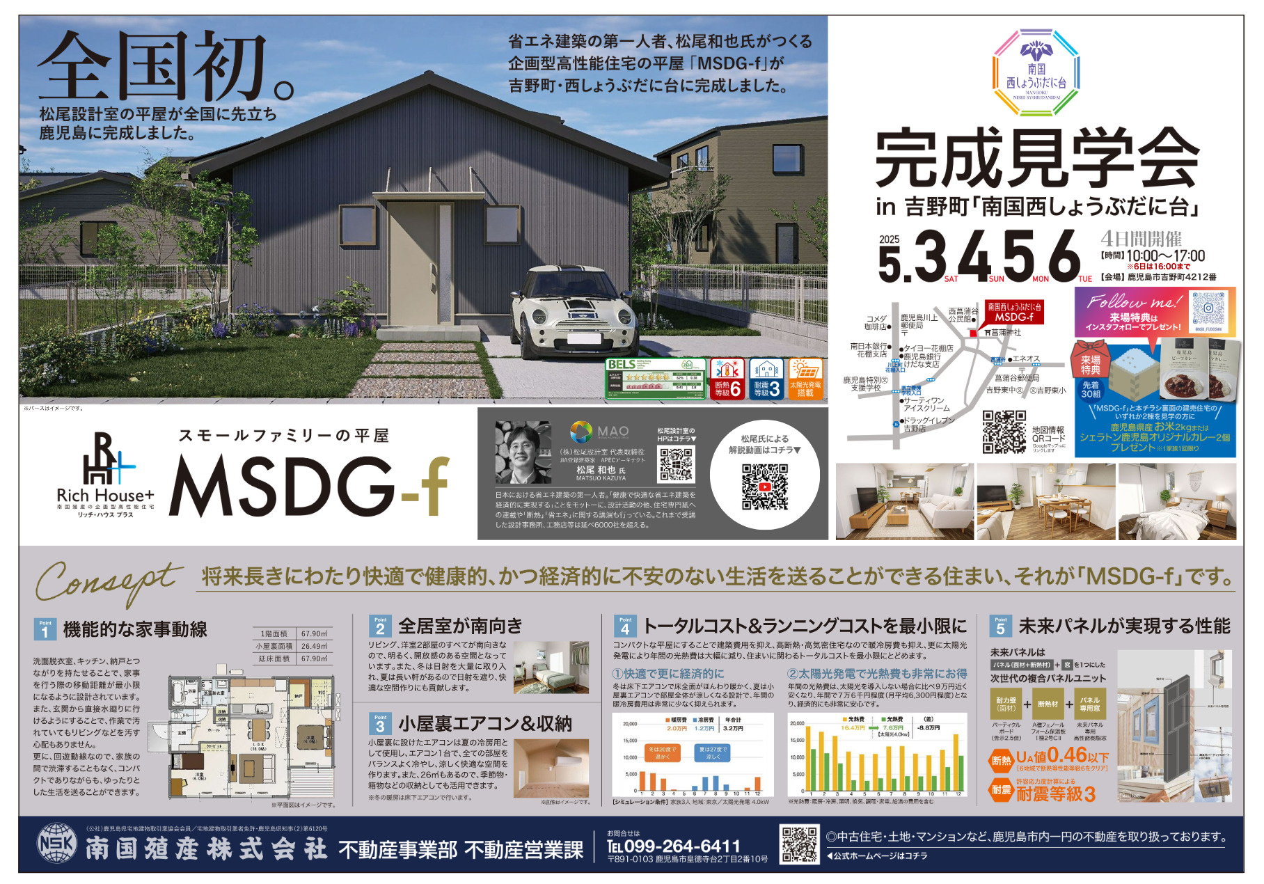 全国初となるMSDG-fの実棟を直接ご覧いただき体感できる機会となりますので、鹿児島県で住宅購入を検討している方は、是非、この機会にご参加いただければと思います。